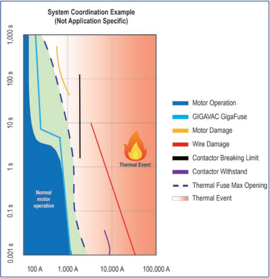 Por ejemplo, en una situación con un contactor de 500 amperios y un fusible de 500 amperios, a 1000 amperios el fusible tardaría segundos en dispararse; en cambio, un GigaFuse puede configurarse a 1000 amperios y dispararse en 3 milisegundos. Con los fusibles térmicos existe una “zona gris” donde los niveles de corriente pueden superar la capacidad del contactor para interrumpir la carga sin llegar aún al punto térmico necesario para que el fusible se active. Este intervalo de tiempo —en el que se excede la capacidad de corte del contactor antes de que el fusible térmico pueda activarse— se elimina con el GigaFuse.
